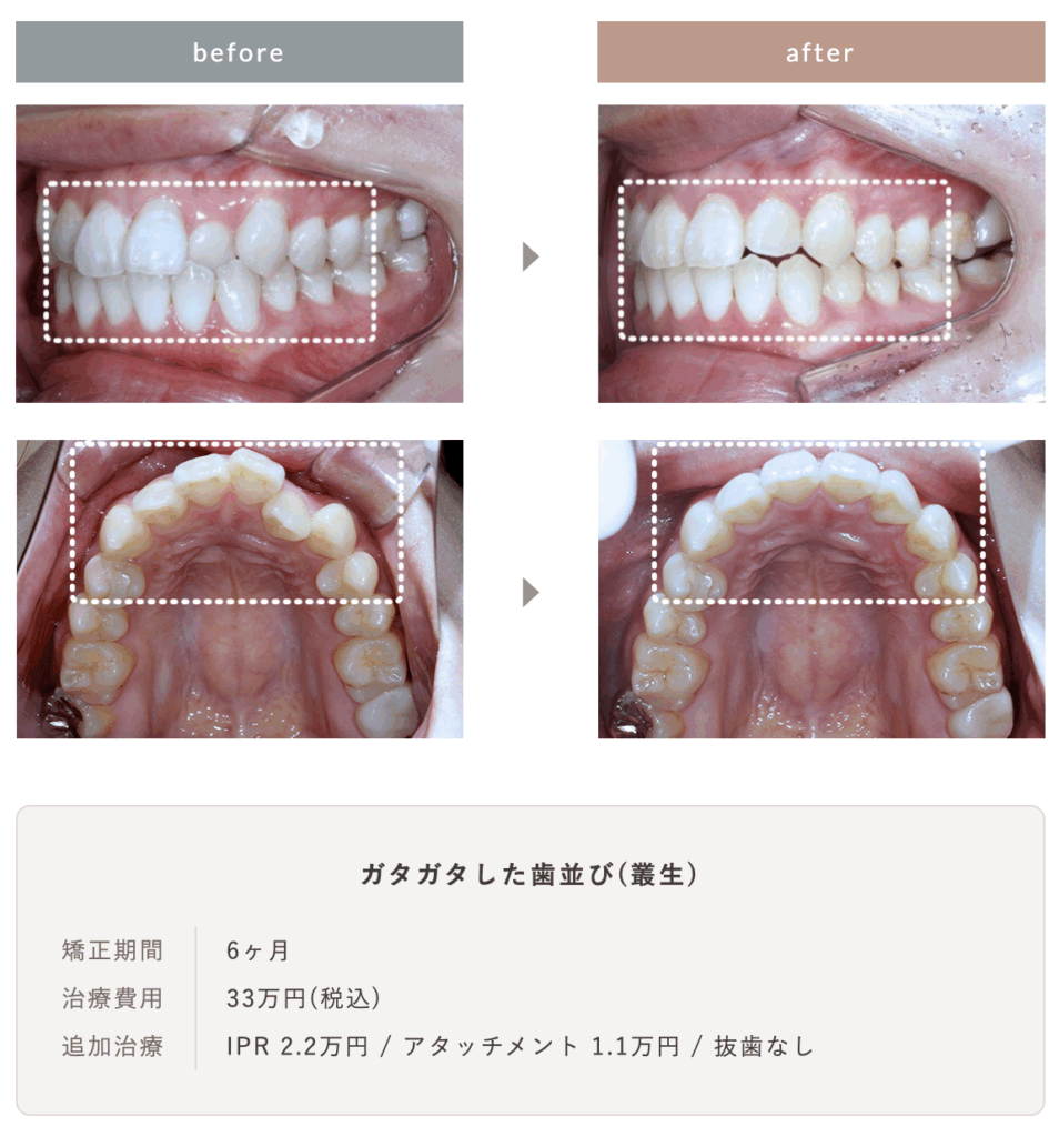 叢生(ガタガタした歯並び)を改善した症例【ビフォー・アフター】を紹介